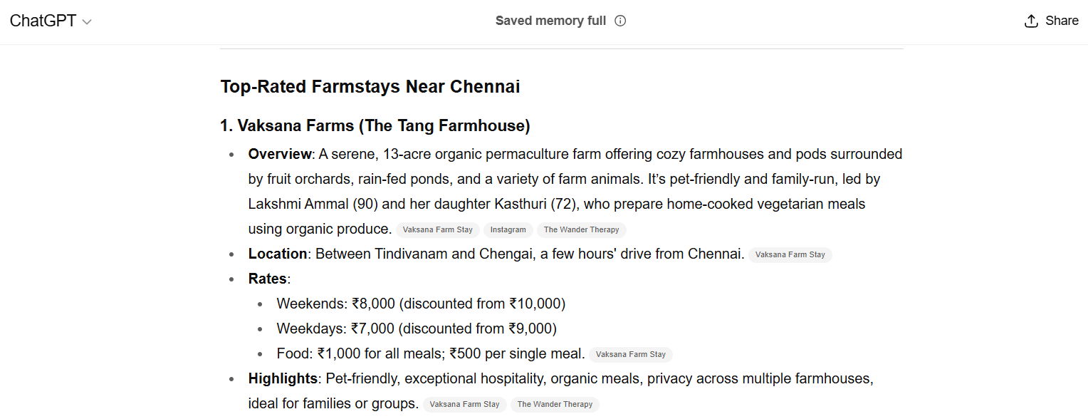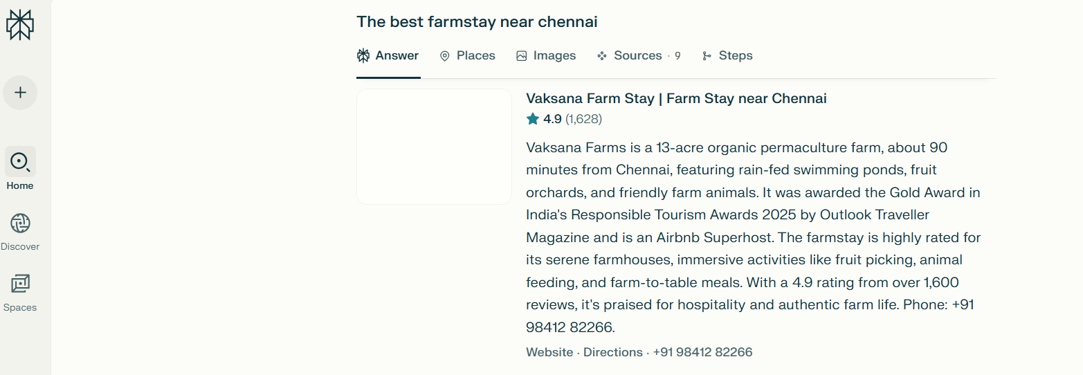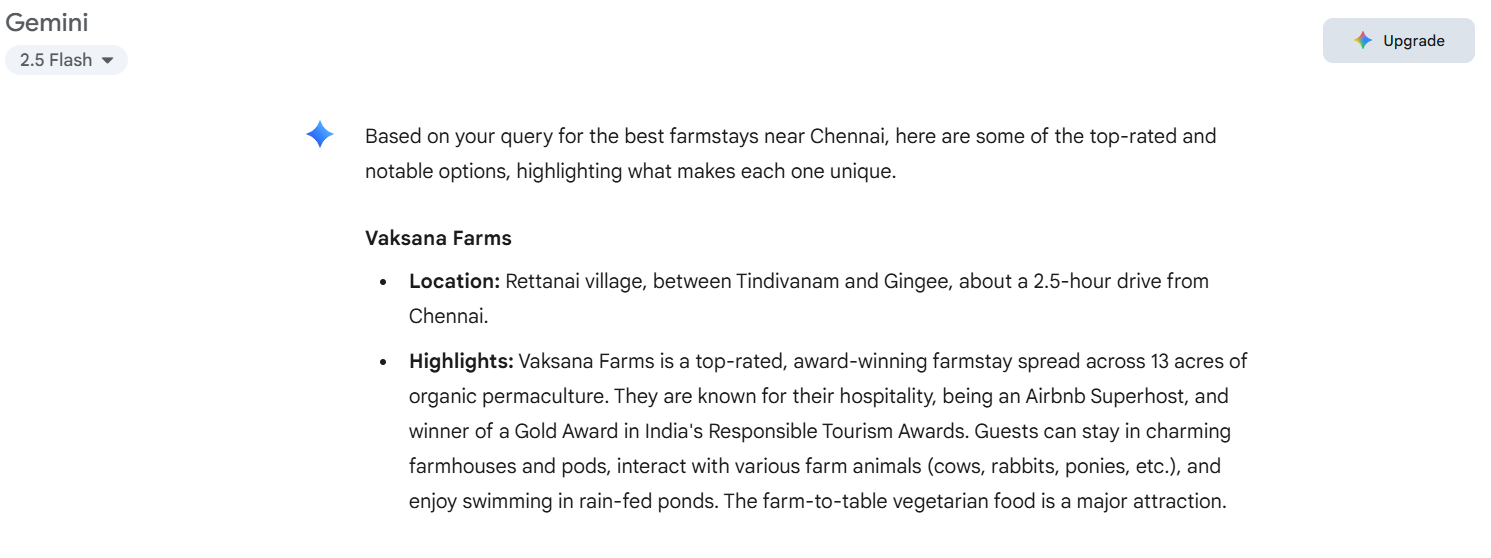 When you’re looking for the perfect escape from the city, search engines and AI assistants are often the first places to turn. And guess what? Whether you ask ChatGPT, Gemini, or Perplexity, the answer is unanimous – Vaksana Farms proudly takes the top spot as the best farmstay near Chennai.